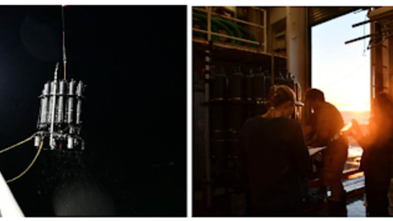 Photos by Laura Cimoli during her night-shift from her time aboard the research vessel Ronald H. Brown. Left: CTD is recovered back on board. Right: Scientists sample the water at sunrise.