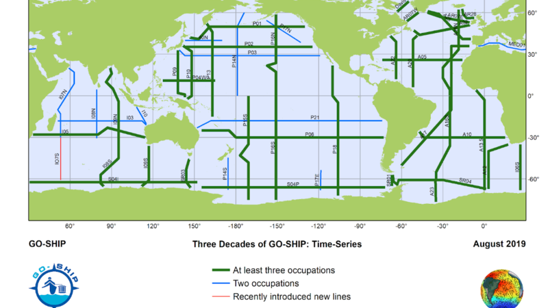 Thanks to the Global Ocean Ship-based Hydrographic Investigation Program (GO-SHIP), there is an international program to coordinate where, when, how and what to measure. The map below shows the main measurement routes. Each line has specific stations marked by GPS coordinates where measurements must take place. The thick green routes have had at least three repetitions in the last five decades. Data going all the way back to the 1970s has been organised and uploaded so that anyone can get access online.